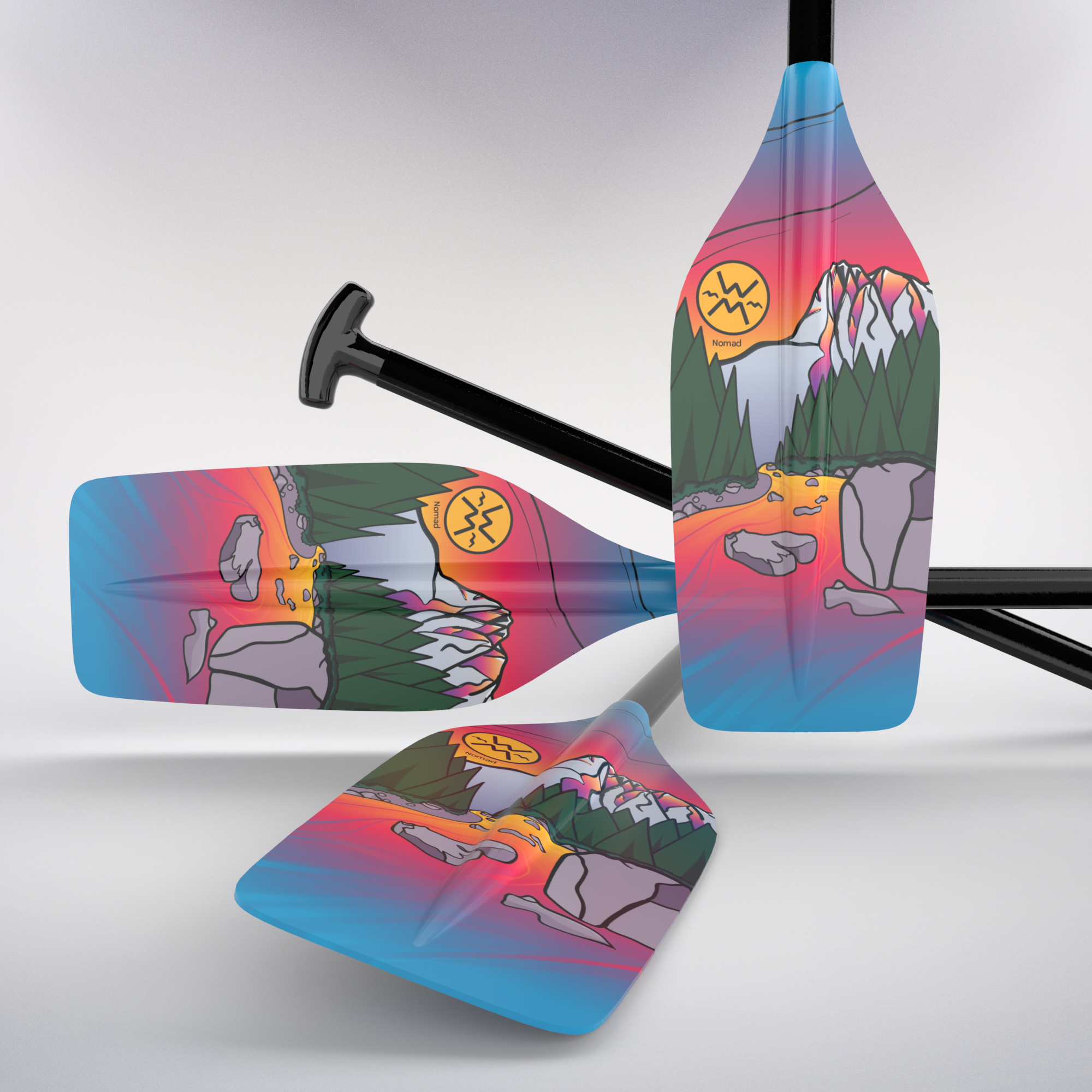 For rafters looking for the utmost performance and durability, the Nomad is an all-around paddle featuring a fiberglass oval shaft and tapered blade design.. Whether you are R2’ing down your favorite creek or running big water within a larger team, the tapered blade shape is an excellent option. Available in a stunning silhouette pattern of Split Rock on the Skykomish River, WA we’re calling “Dugan’s Sky: Alpenglow”.